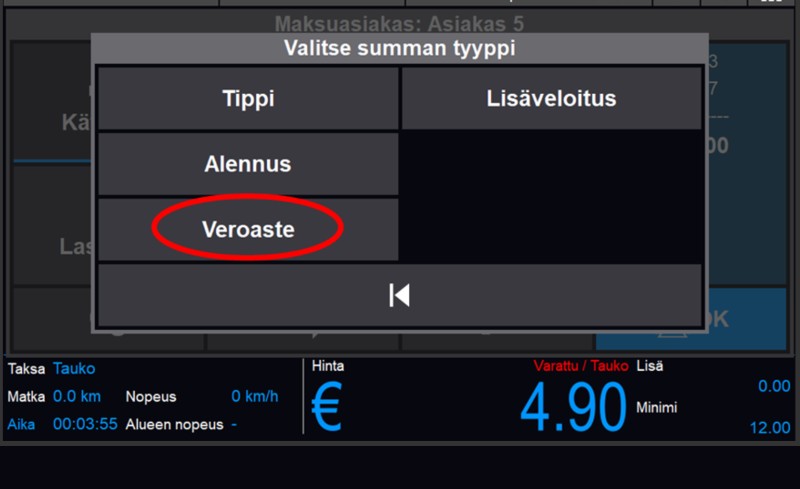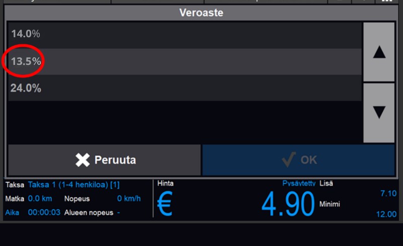 Veroastetta muutetaan kyydin päättymisen jälkeen kassalla. Tämä tapahtuu lisäveloitukset valikon alta “Veroaste” painikkeella. Veroaste painikkeen painamisesta avautuu uusi ikkuna, jossa näkyy vaihtoehdot veroasteelle. Valitse valikosta ALV 13,5 % vaihtoehto.