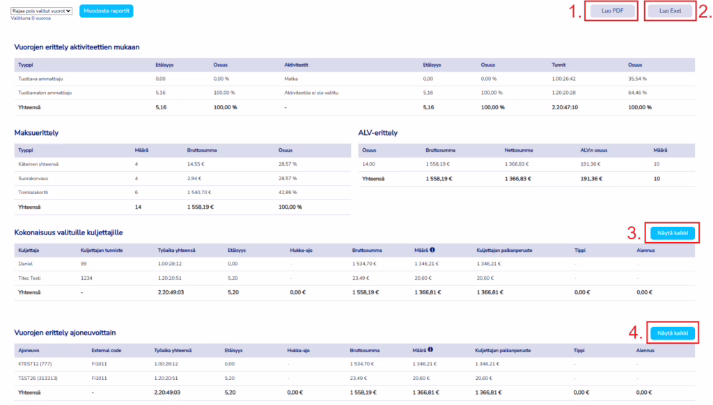 - Tästä näkymästä näet kaikista kuljettajista yhteenvedon, mikäli et ole rajannut valintaa vain tiettyyn kuljettajaan.